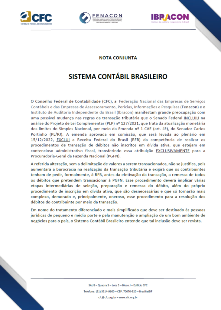 O CFC, a FENACON e o Ibracon redigiram uma nota sobre a possível mudança nas regras da transação tributária que o Senado Federal incluiu na análise do Projeto de Lei Complementar (PLP) nº 127/2021, que trata da atualização monetária dos limites do Simples Nacional. Veja abaixo e entenda as preocupações relacionadas aos profissionais da Contabilidade.